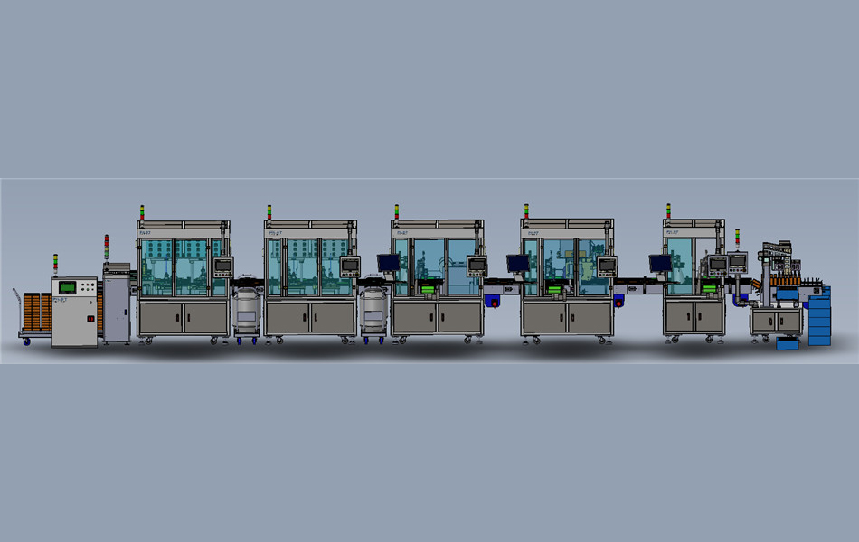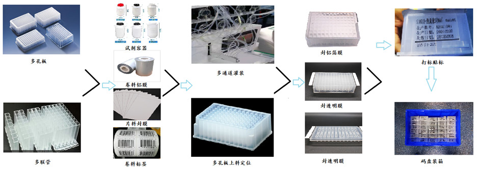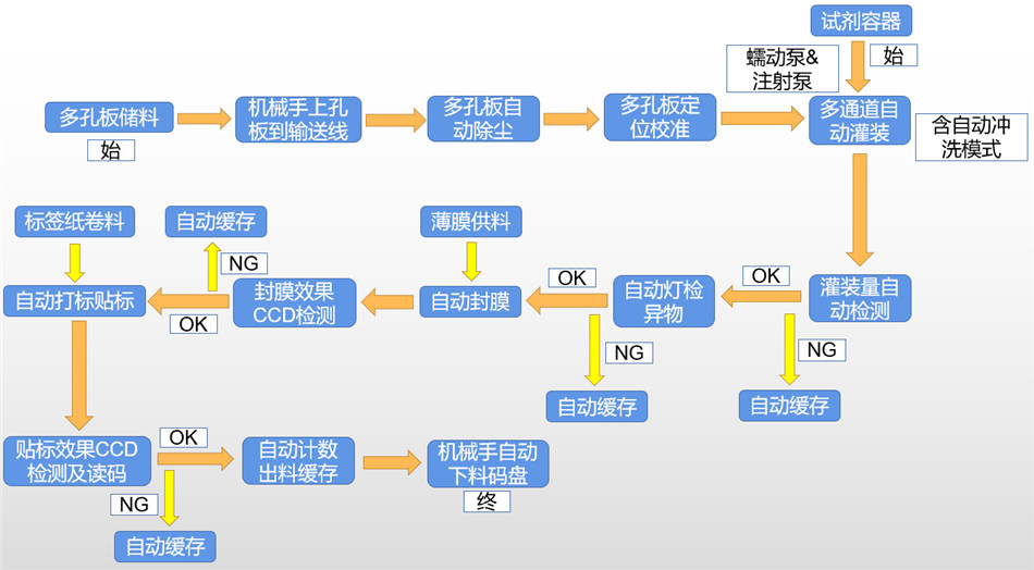 本產線可實現多孔板周轉車儲料—>自動供料—>自動吸塵—>自動定位—>自動灌裝—>自動燈檢異物—>自動檢測灌裝量—>自動注硅油—>自動封膜—>封膜效果CCD檢測—>自動打標貼標—>CCD讀碼及貼標效果檢測—>自動計數出料緩存—>自動碼盤裝箱及各工位不良品剔除緩存等一系列動作,使該類產品的灌裝封膜貼標工序實現完全自動化,提升產能及品質,節省人工。